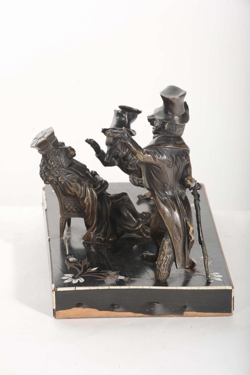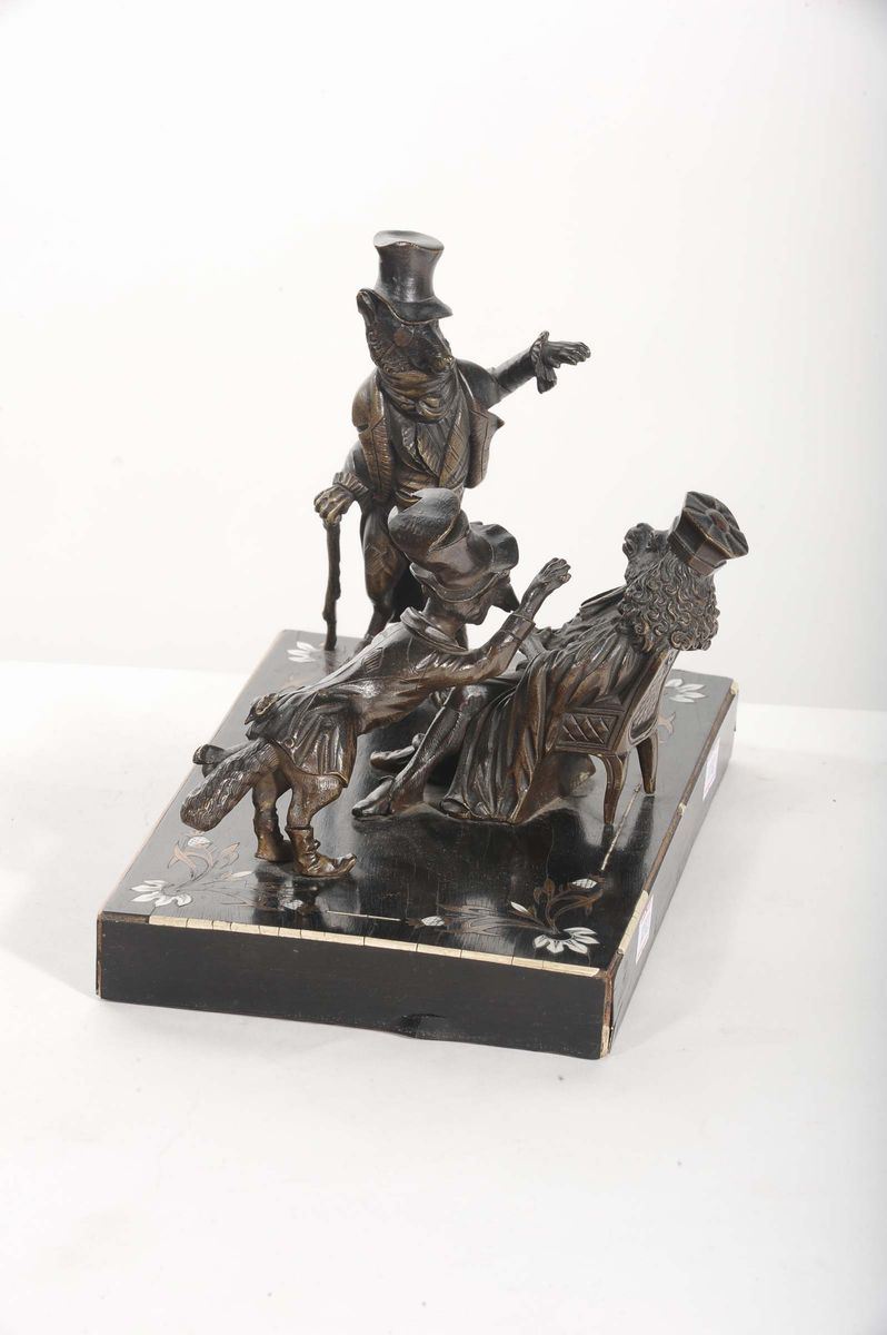 Gruppo in bronzo su base in legno intarsiato, XIX secolo