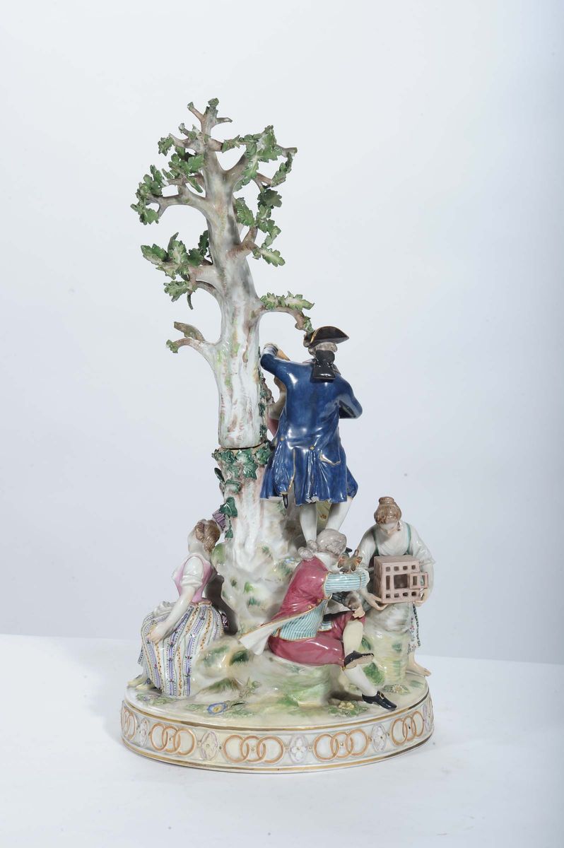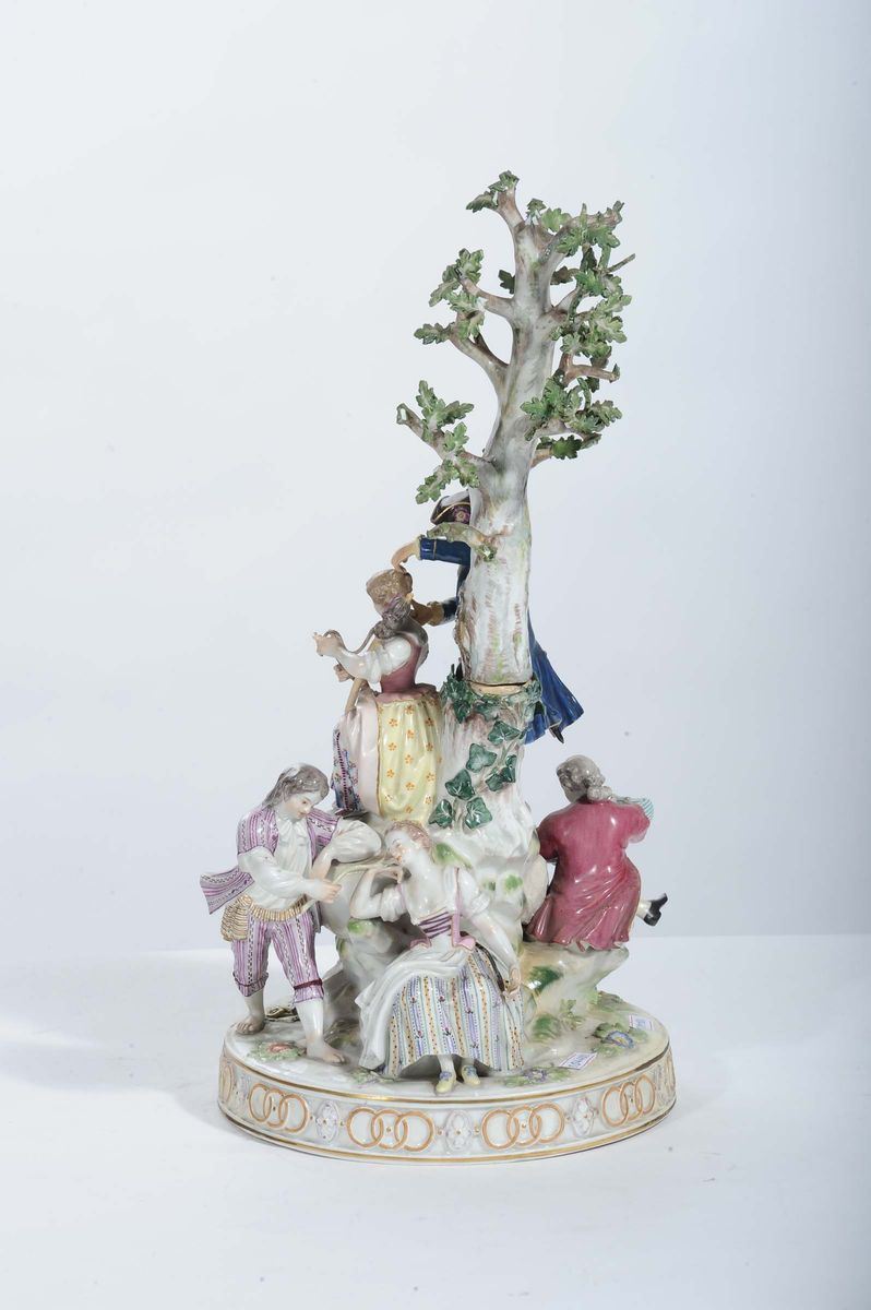 Gruppo in porcellana di Meissen raffigurante scena galante attorno ad albero, XIX secolo