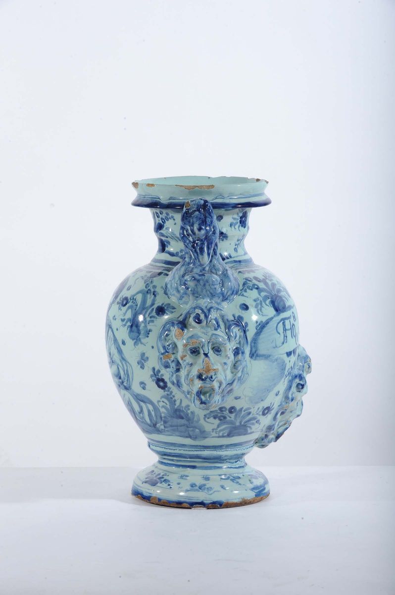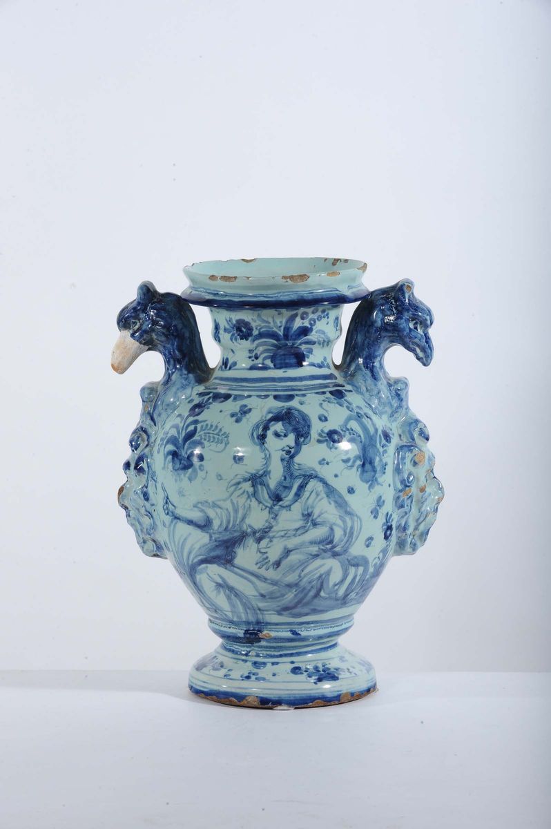 decoro nei toni del blu a motivo vegetale e floreale, base circolare, corpo con mascheroni in rilievo e prese a teste di uccello, altezza cm 38 (difetti e restauri)