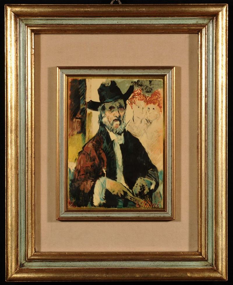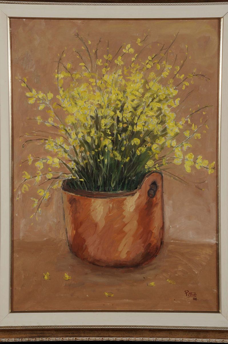 raffiguranti Pittin vaso di fiori, figura femminile, scena di genere e uomo con cappello e barba