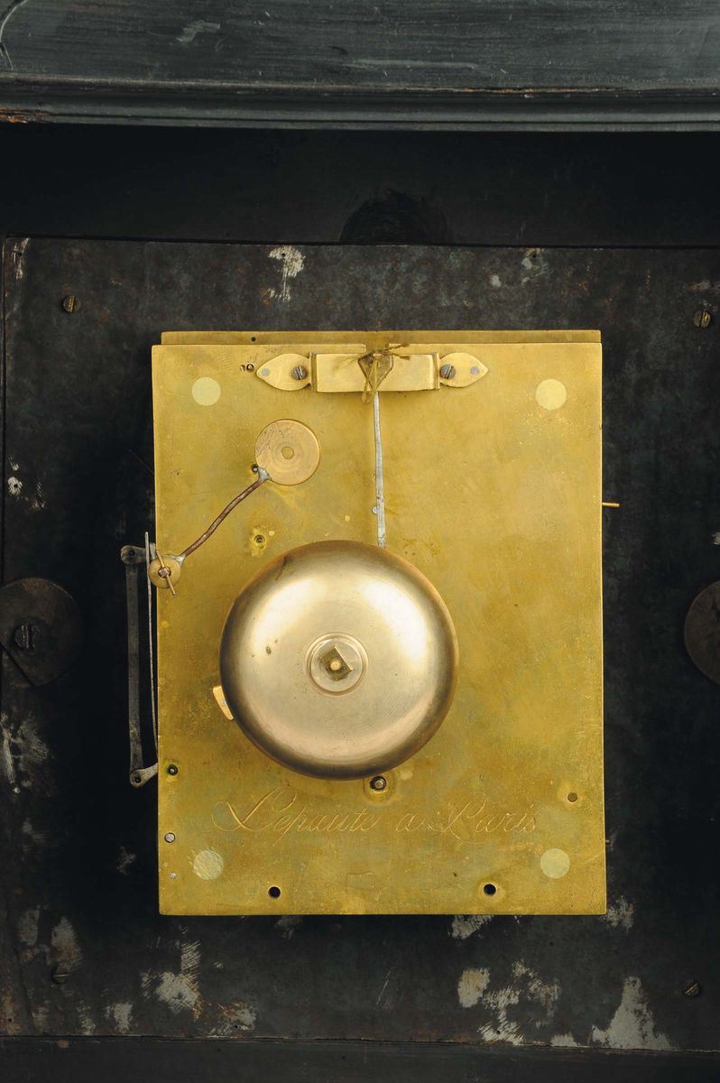 cassa in legno ebanizzato e base sagomata sorretta da quattro piedini circolari in bronzo dorato. Quattro lesene, ornate da una base e un capitello in bronzo dorato, sono collocate ai quattro angoli della cassa e incorniciano sul fronte lo sportello del quadrante. Nella parte superiore un timpano spezzato, arricchito da elaborate modanature, ne esalta la struttura che rimanda alla classica architettura delle chiese. Un fregio a motivi floreali e di valve è applicato sul frontone e ai laterali della cassa, mentre un velluto rosso fa da contrasto. Il quadrante è in bronzo dorato con quattro angolari floreali e una fascia oraria in metallo argentato e inciso con numerazione romana per le ore e la minuteria suddivisa in quinti a numeri arabi. Due lancette in metallo traforate a fantasia indicano il passare del tempo.Meccanica coeva ma non pertinente, con scappamento a verga e sospensione a filo, suoneria a ore al passaggio su campana. Bariletto unico per il treno del tempo e della suoneria.