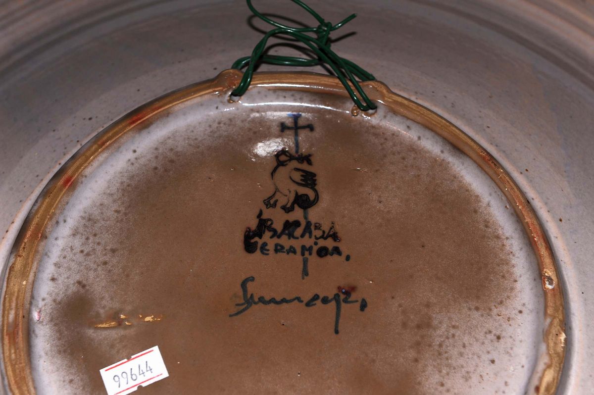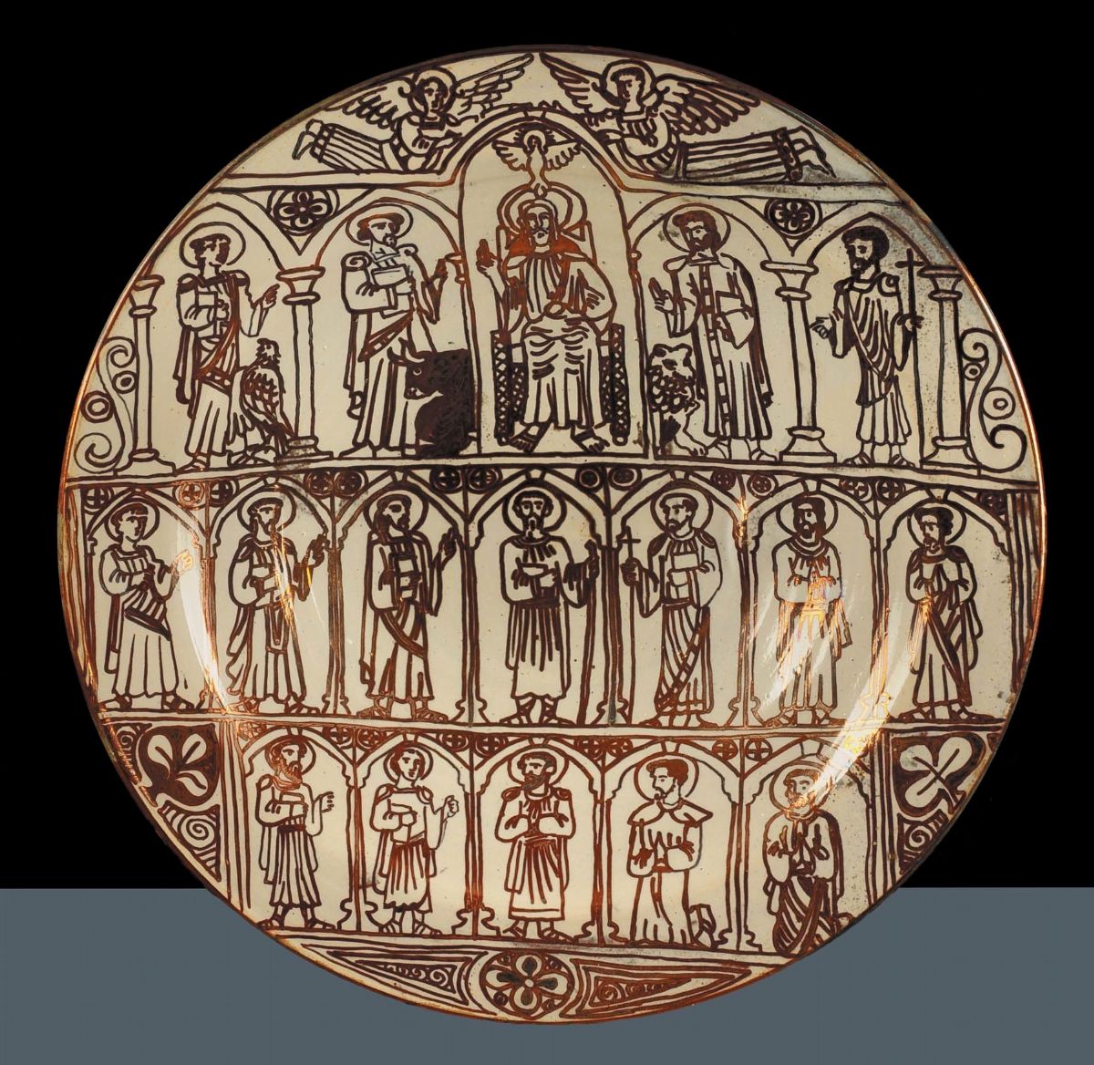 Piatto in maiolica a fondo bianco con decoro a lustro raffigurante Santi, Spagna Ibacaba XIX secolo