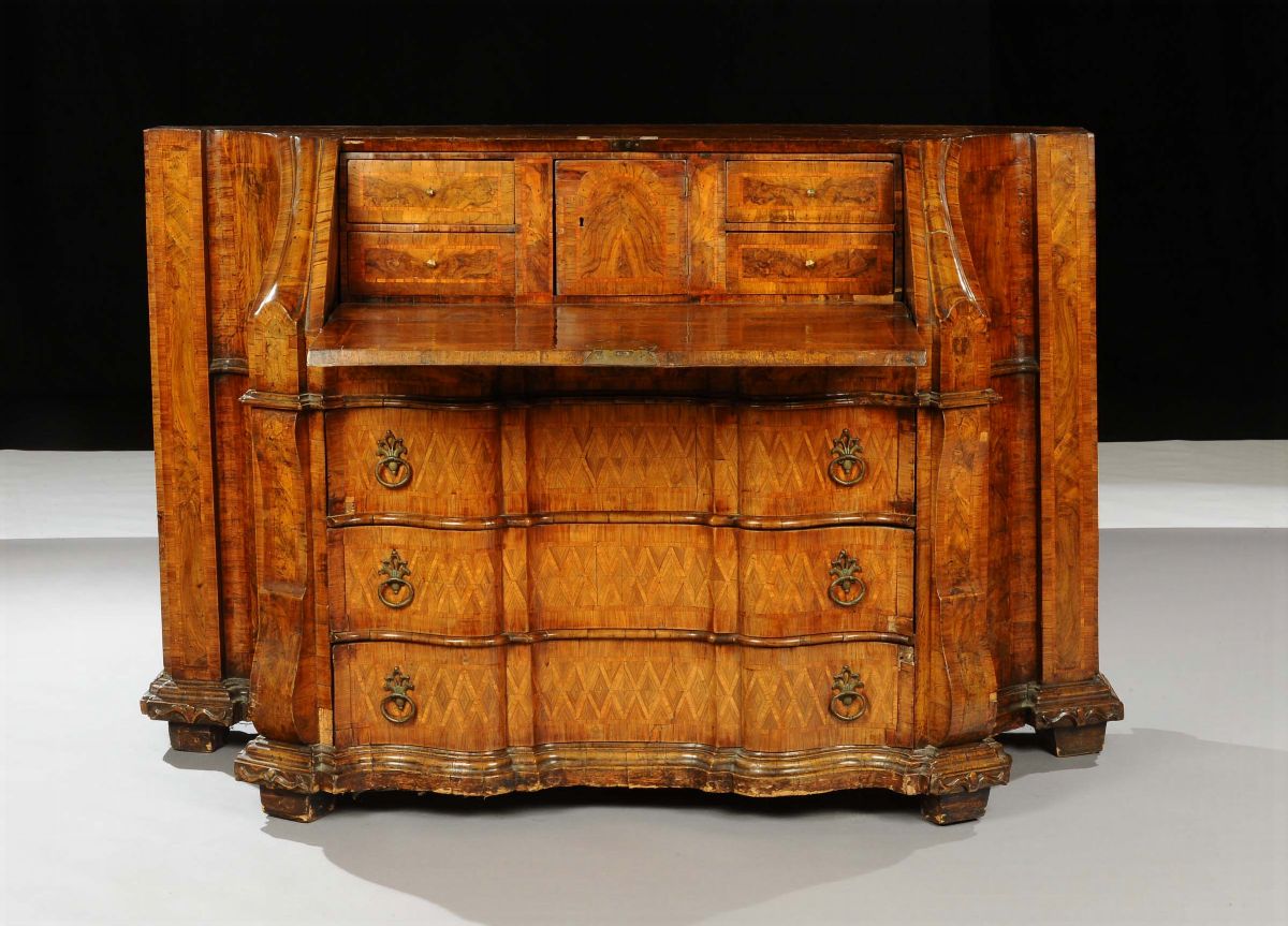 Ribalta Luigi XV lastronata in noce e radica di noce, filettata con essenze esotiche, Venezia secondo quarto del XVIII [..]