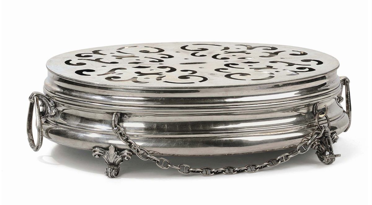 Scaldino in argento ovale poggiante su piedini a ricciolo, gr. 1500