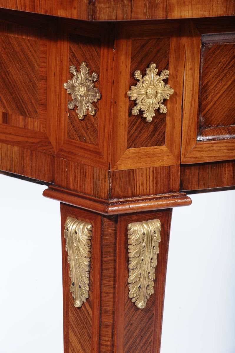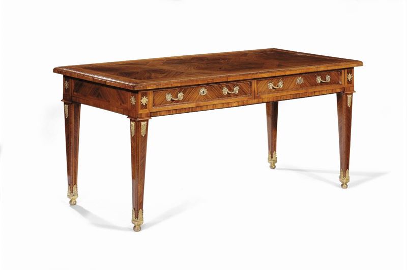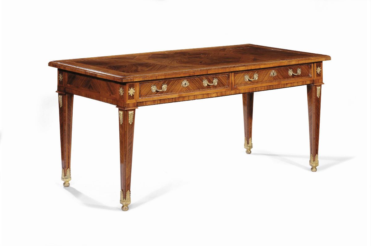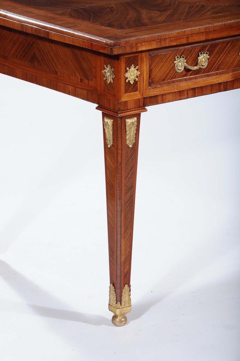 piano rettangolare, cintura dritta recante due cassetti e decorati da applicazioni in bronzo dorato, gambe troncopiramidali, cm 171x81x79