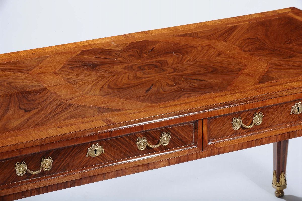 Scrivania diplomatica Luigi XVI lastronata in noce e radica di noce, Genova XVIII secolo