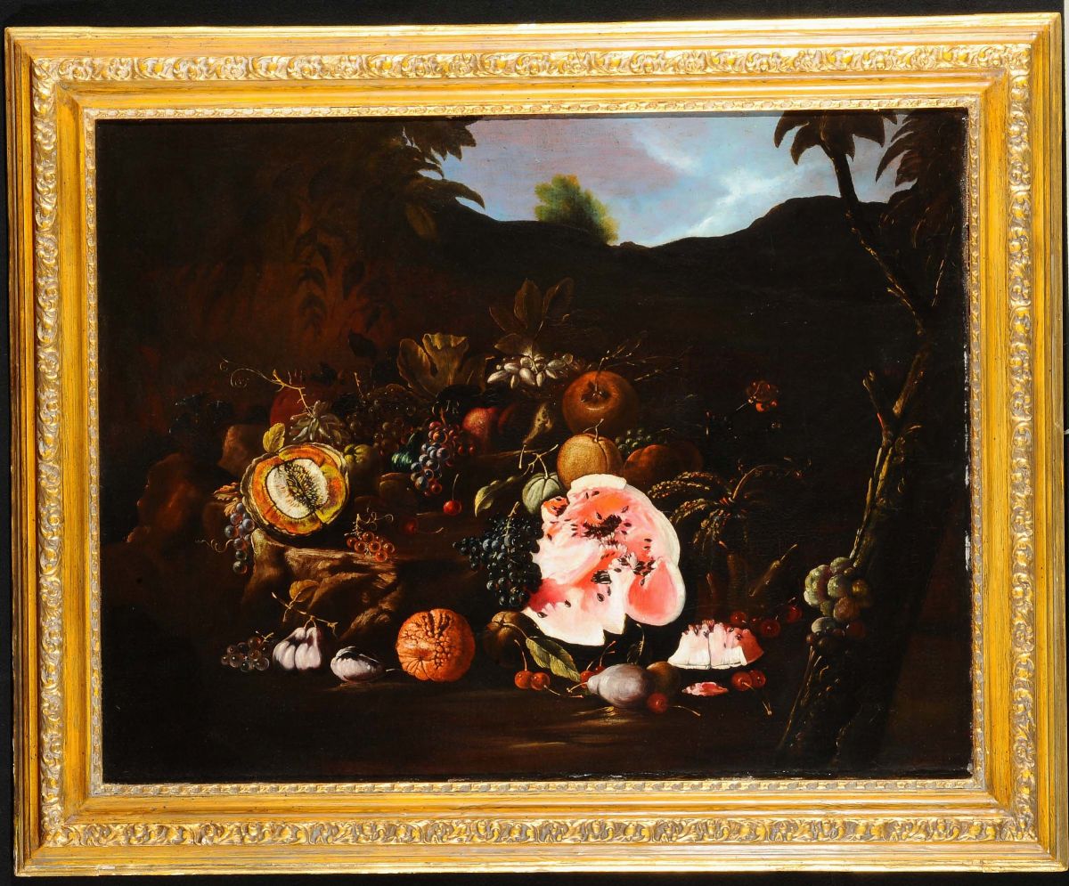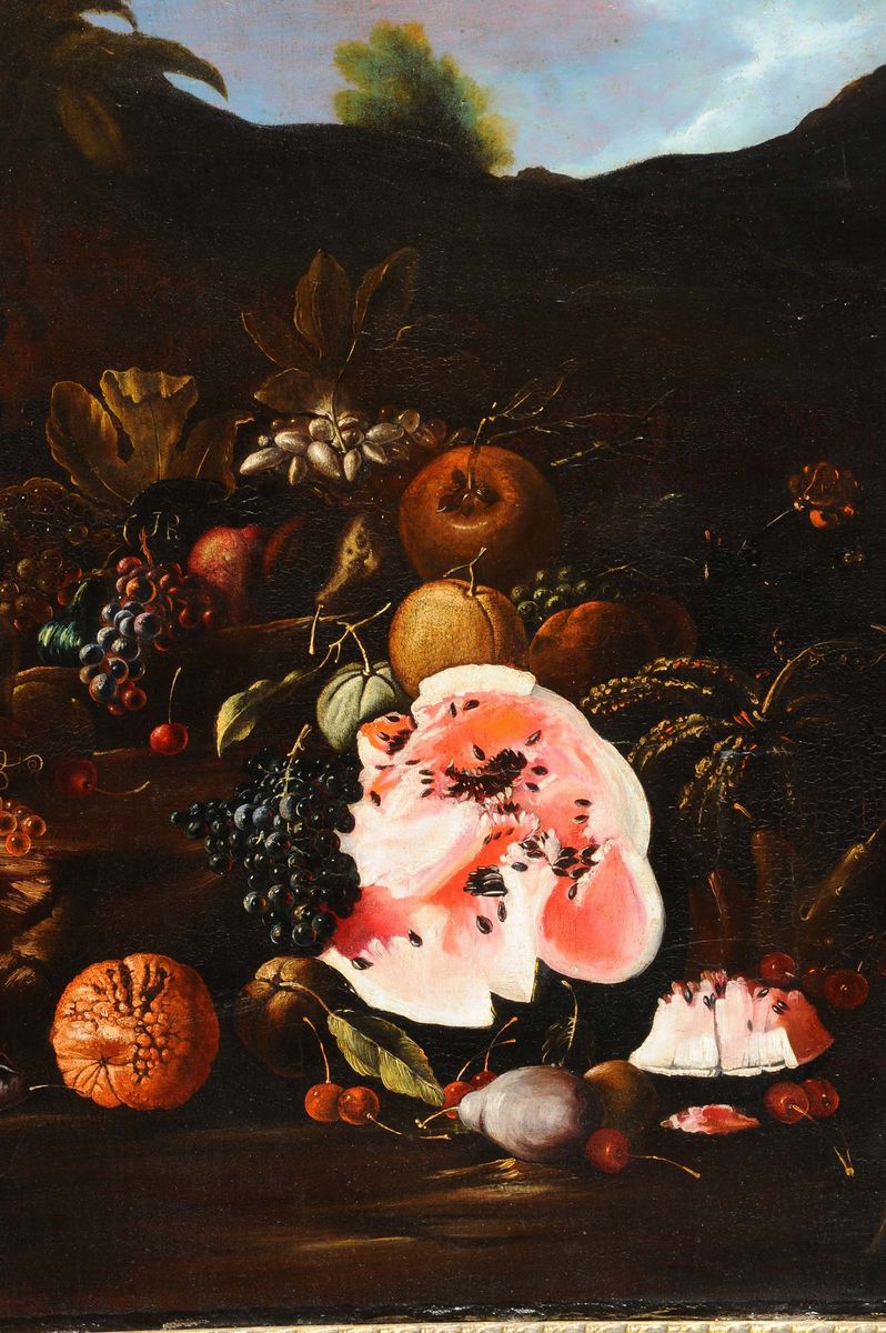 Scuola del XVIII secolo Natura morta con frutta e zucca