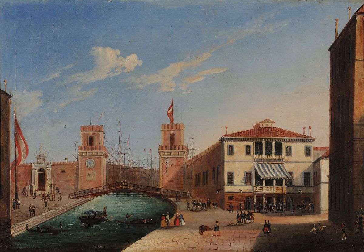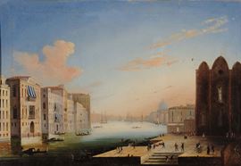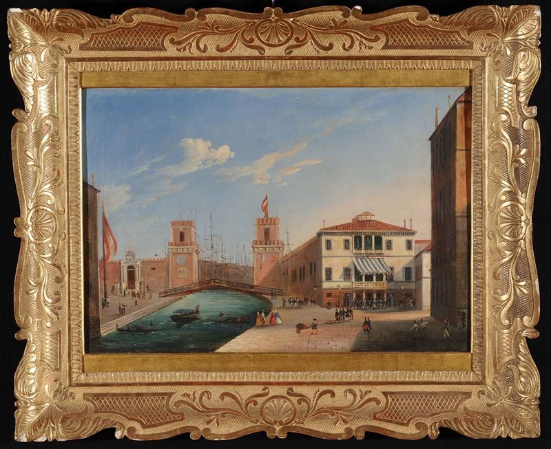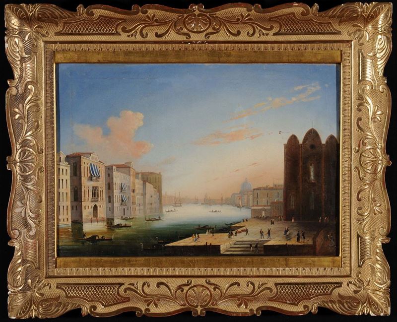 coppia di dipinti ad olio su tela, cm 42x63, entro cornici a guantiera dorate