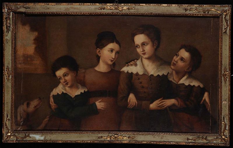 Scuola della fine del XVIIII secolo Quattro giovani con cane