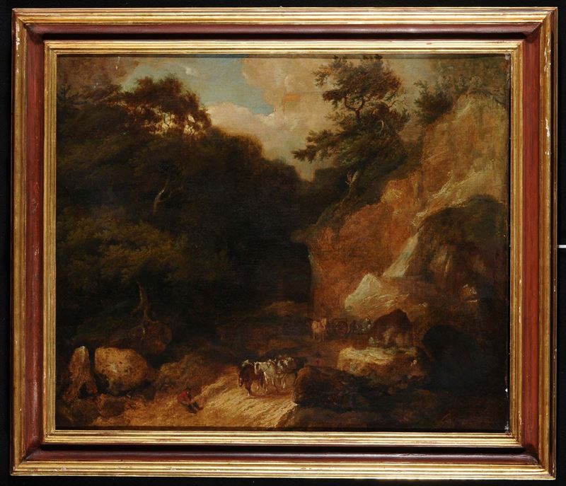 Scuola Fiamminga del XVIII secolo Paesaggio boschivo con viandanti