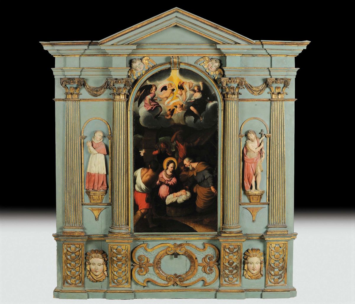 olio su tela, cm 95x49, in grande cornice a tempietto con colonne scanalate laccata e dipinta in policromia, cm 170x156