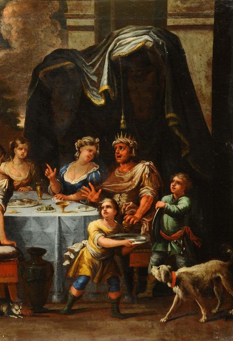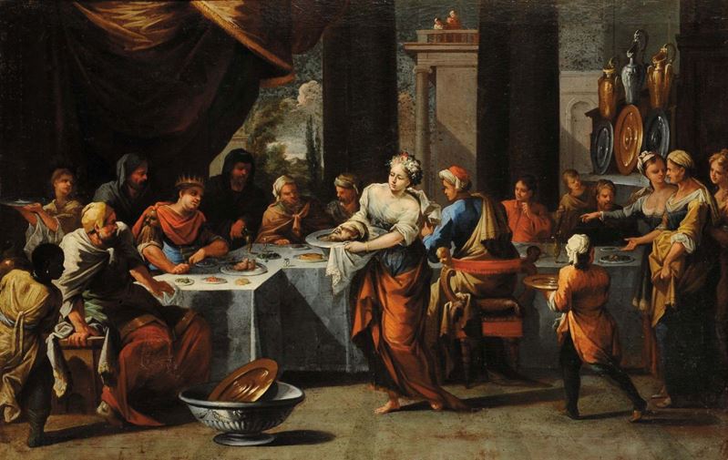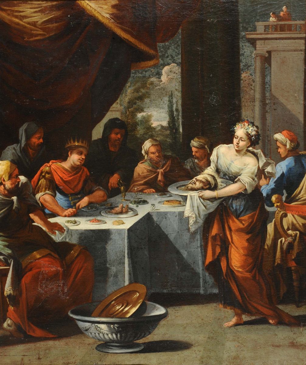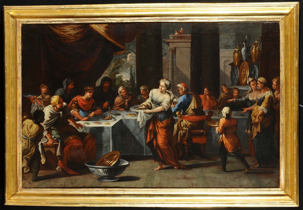 Scuola Veneta del XVII secolo Salomé con la testa del Battista Profezia durante banchetto