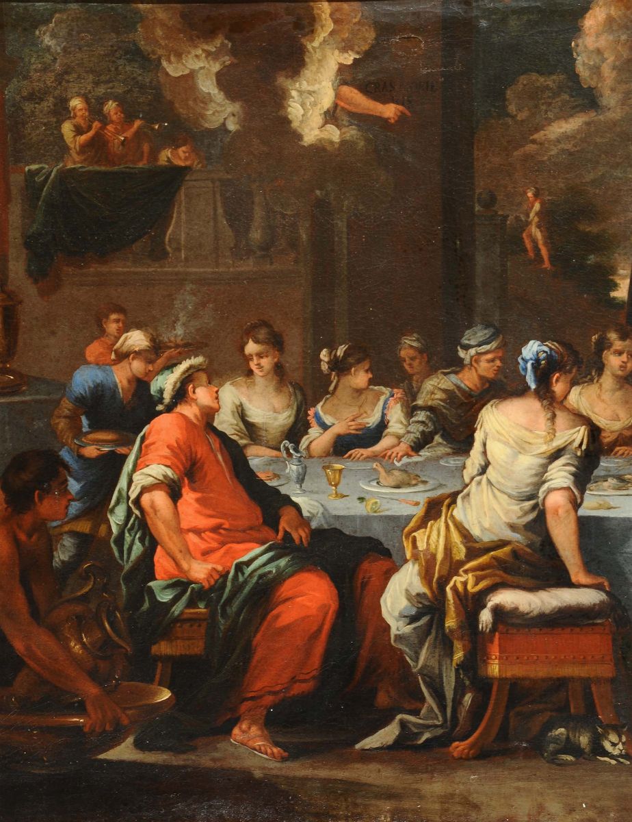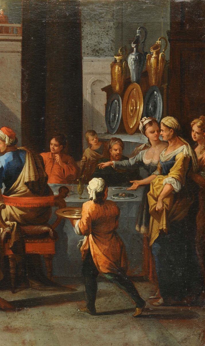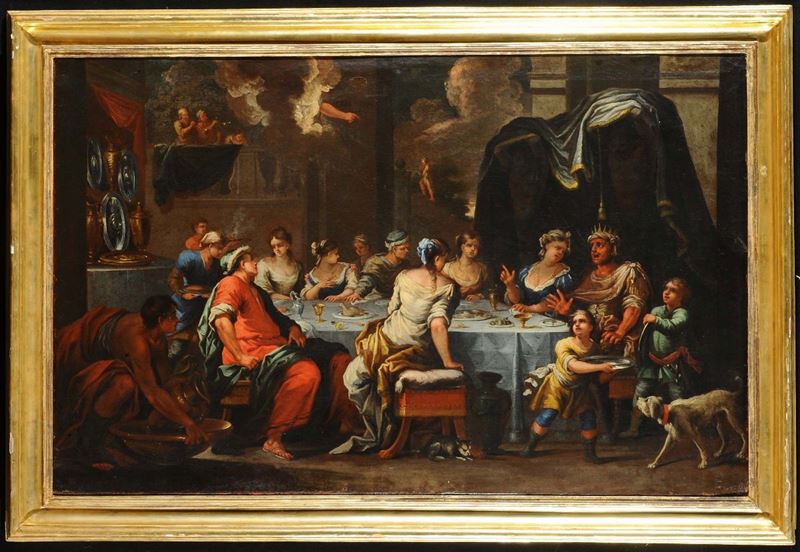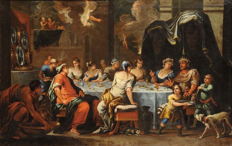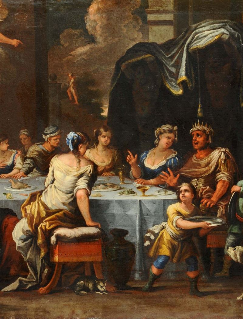 Scuola Veneta del XVII secolo Salomé con la testa del Battista Profezia durante banchetto