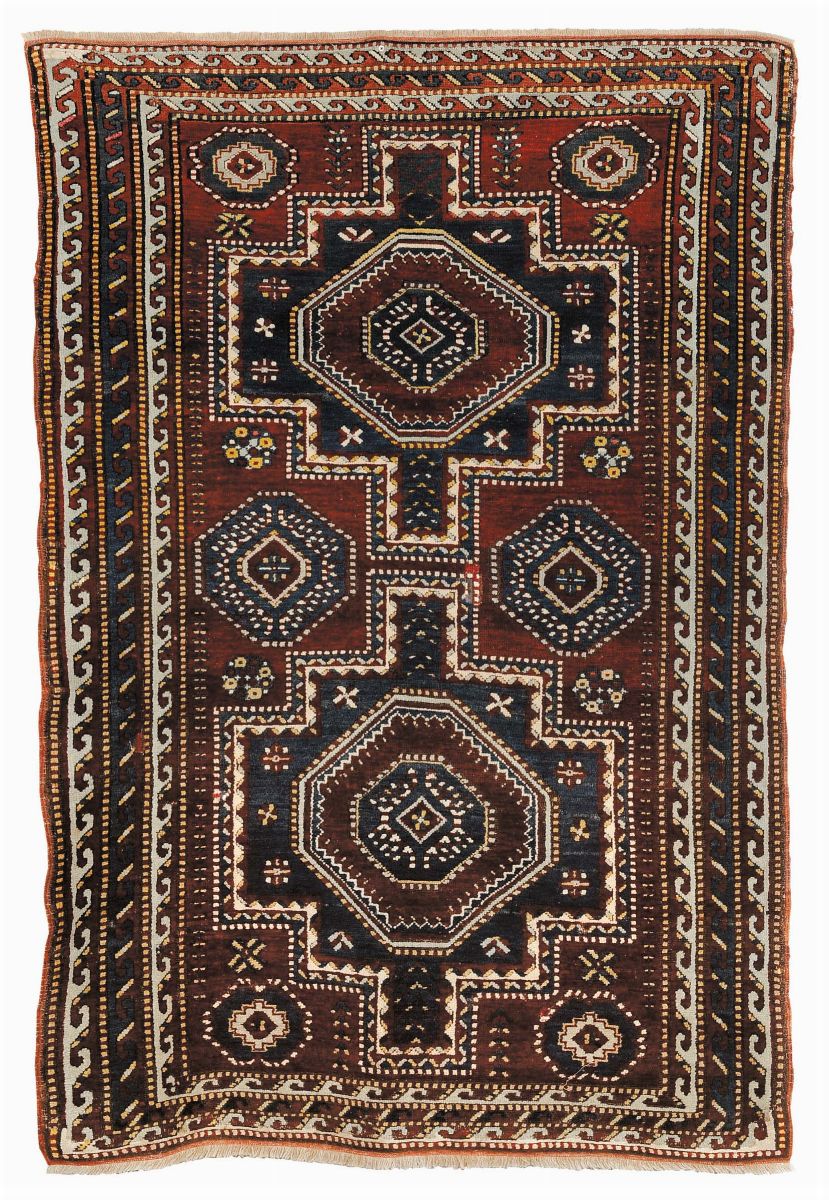 fondo rosso con due medaglioni blu, bordura a running dog, cm 180x120