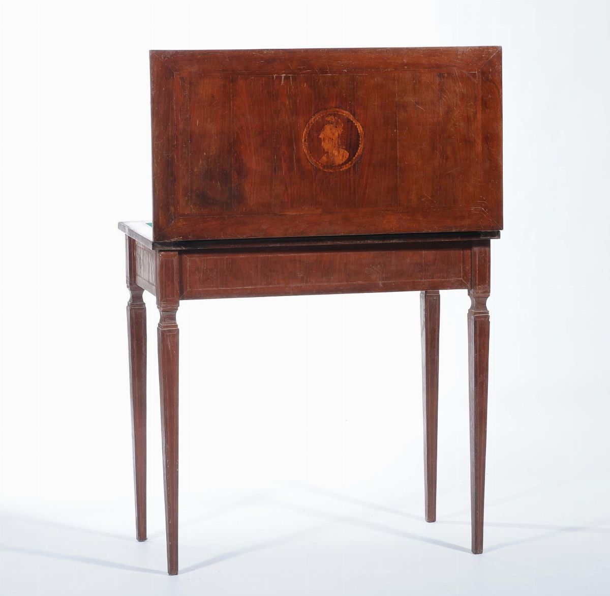 piano con intarsio centrale raffigurante profilo di guerriero entro riserva circolare, gambe troncopiramidali, cm 82x43x80