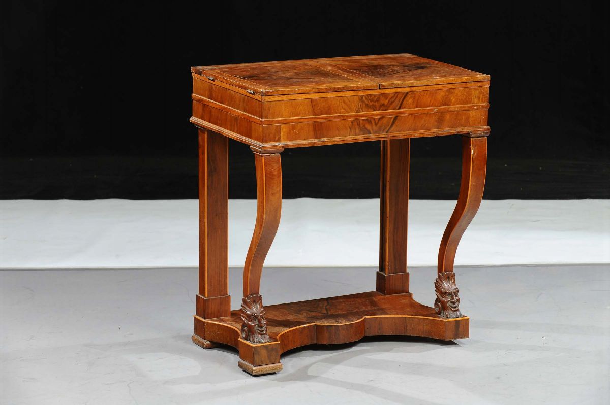 filettata in legni di frutto, a foggia di consolina, piano apribile, gambe anteriori terminanti con mascheroni, cm 66x44x75