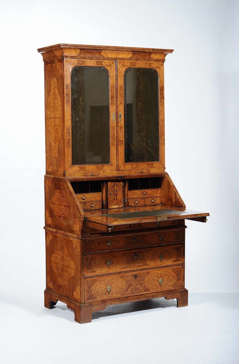 corpo inferiore a tre cassetti, più due più piccoli sottostante la ribalta, decorati da formelle in radica entro filettature, la calatoia, decorata nella stessa maniera, cela scarabattolo con sei tiretti e vani a giorno entro piccolo sportello centrale, corpo superiore a due ante con specchio, cm 94x60x200