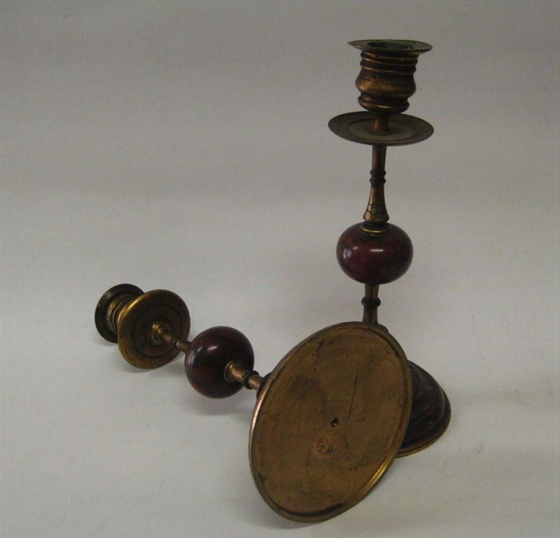 Piccoli candelieri in bronzo e marmo rosso, fine XIX secolo