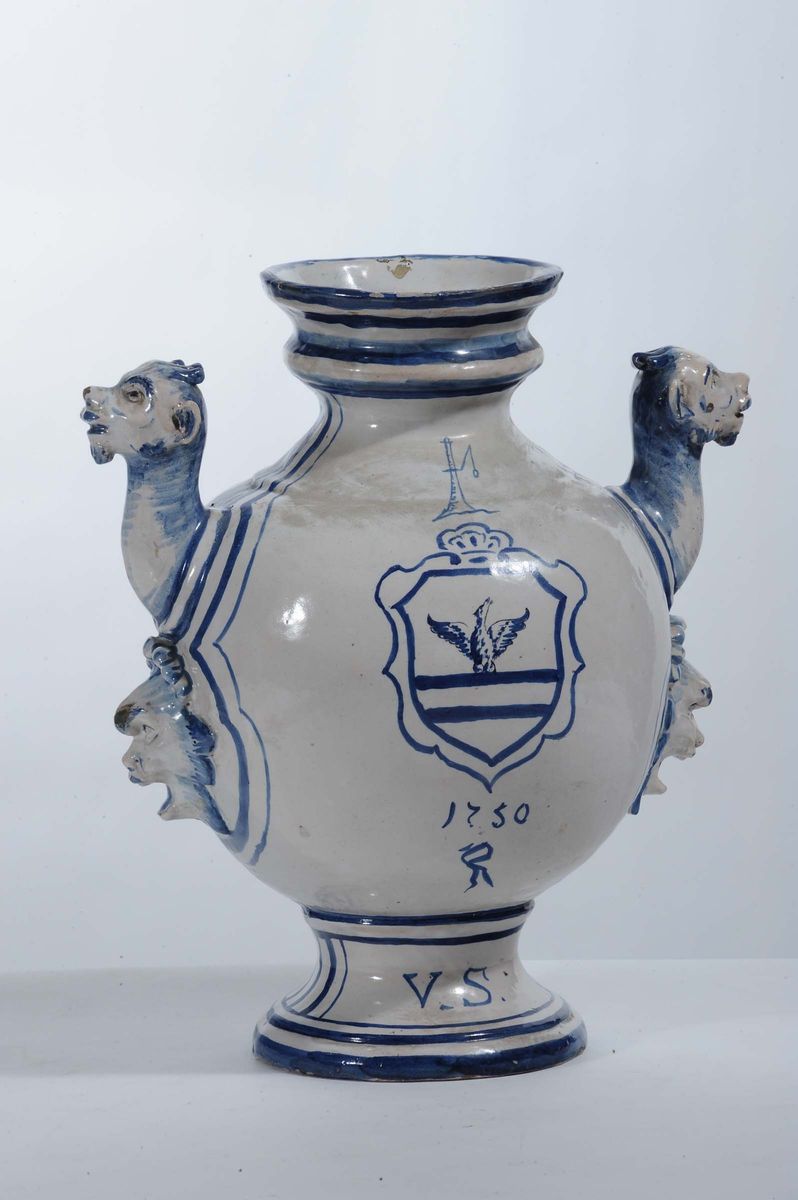 decoro con scena istoriata, mascheroni in rilievo e prese a guisa di teste di animale fantastico, altezza cm 44 (difetti)