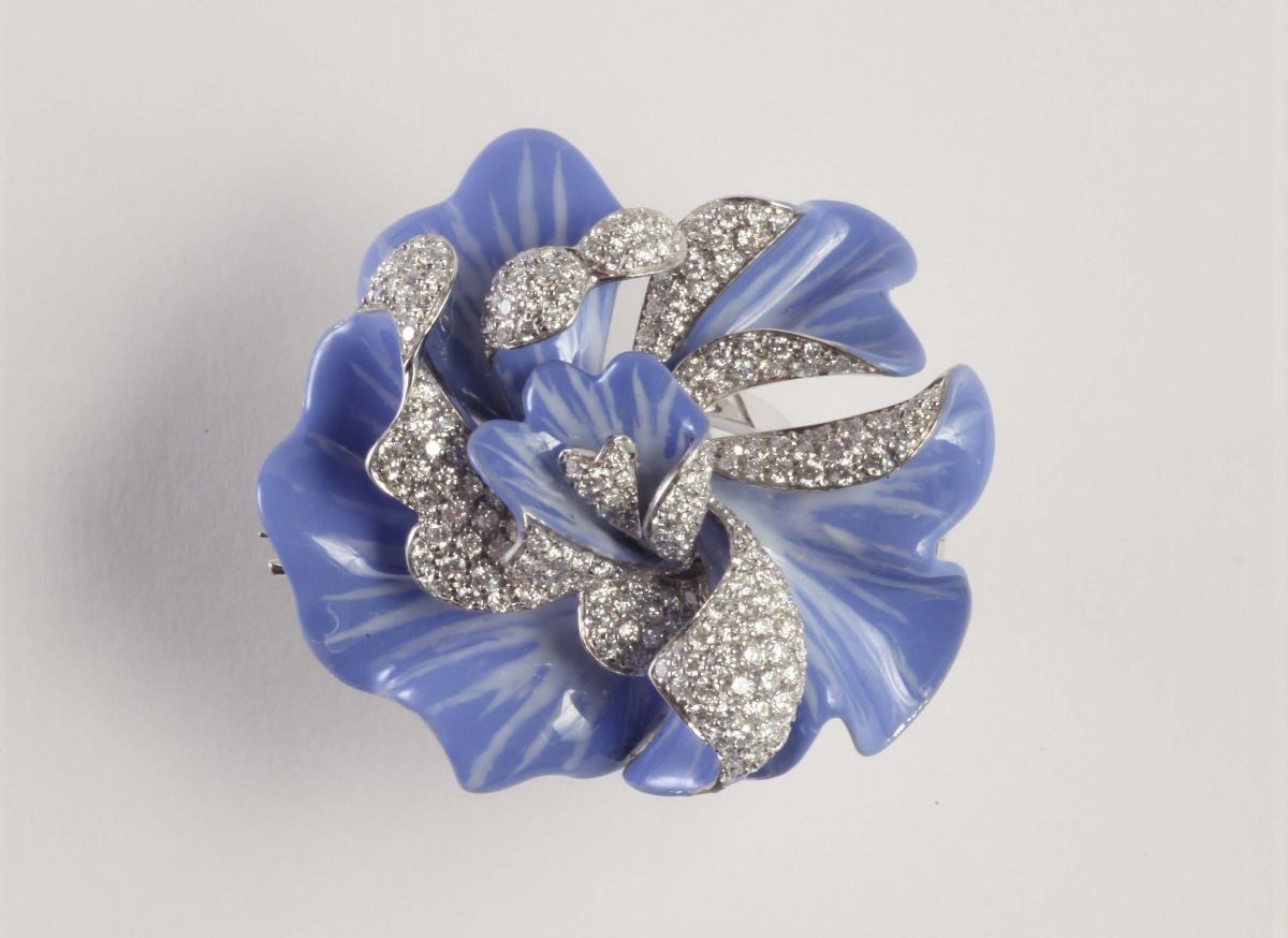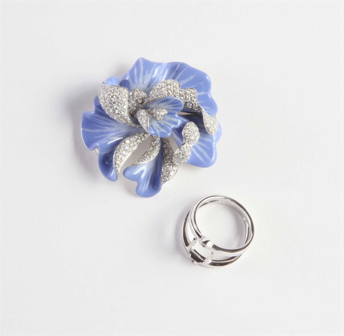 con smalti policromi e diamanti per ct 3,42. Montatura in oro bianco 18Kt. Trasformabile in pendente e spilla