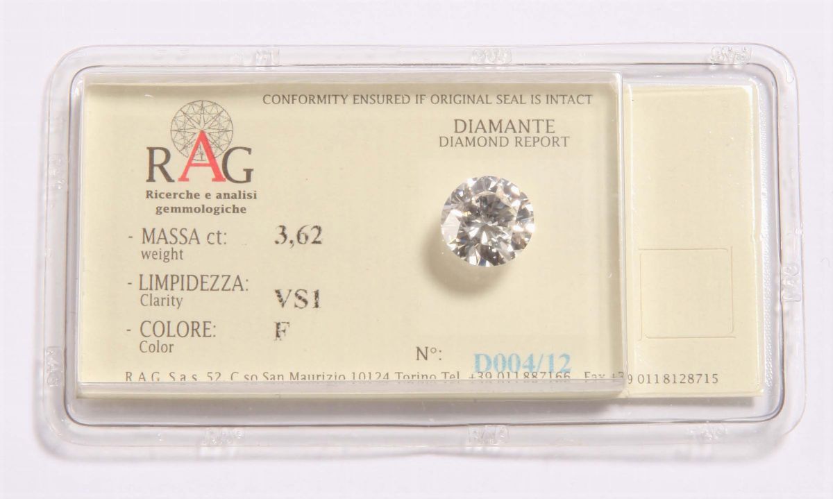 VS1 colore F. Certificato gemmologico R.A.G. Torino