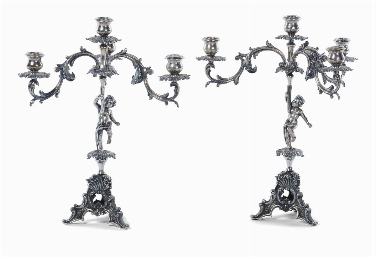 Due candelabri a in argento a quattro luci, gr. 2800
