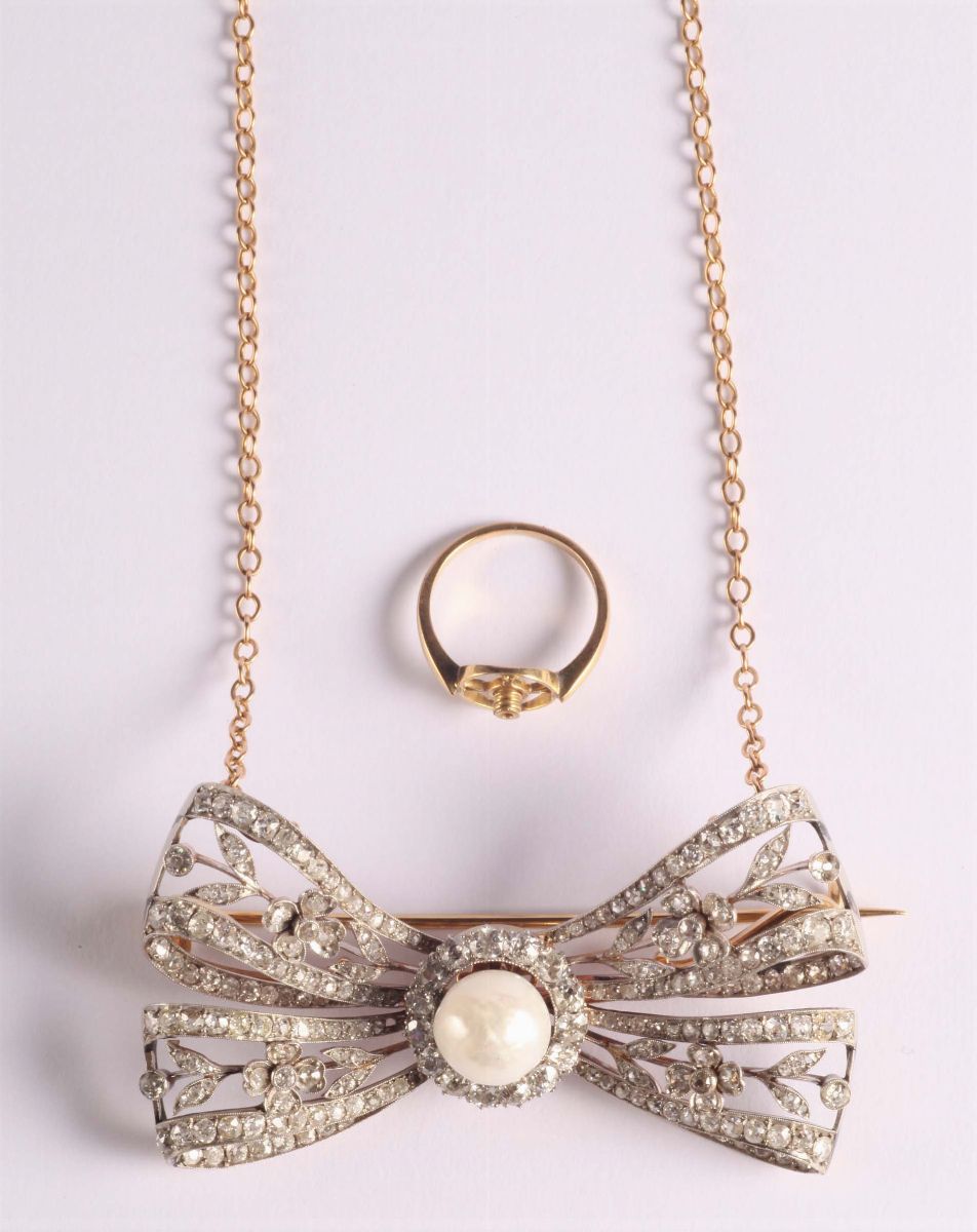 la parte centrale è ornata da una grande perla, trasformabile in anello. Oro giallo 18Kt e platino. Utilizzabile anche come spilla