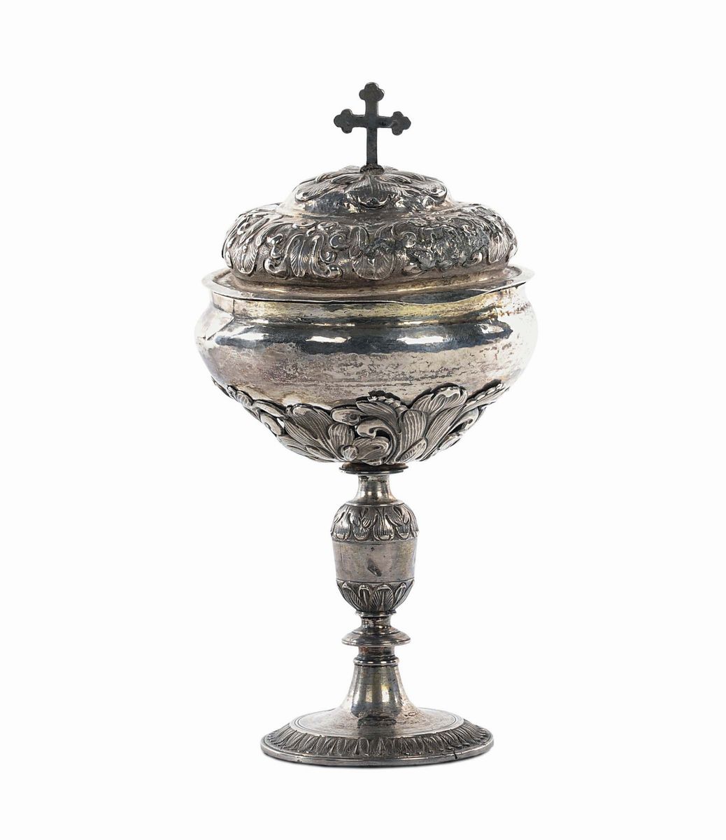 Pisside in argento sbalzato