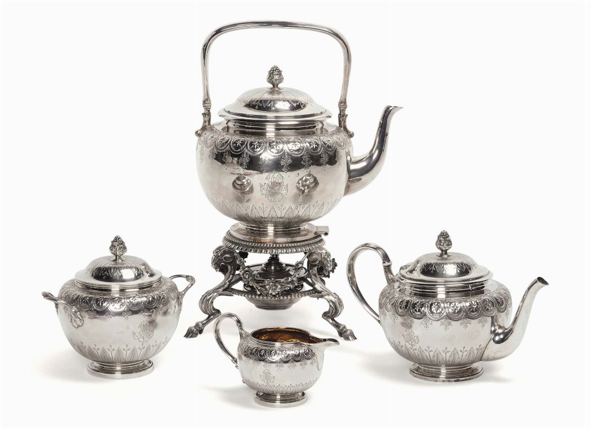 composto da samovar, teiera, lattiera e zuccheriera, di forma circolare decorato con bande di medaglioni fogliacei, monogramma inciso, il samovar poggia su gambe caprine sormontate da teste di arieti, gr. 4100 circa