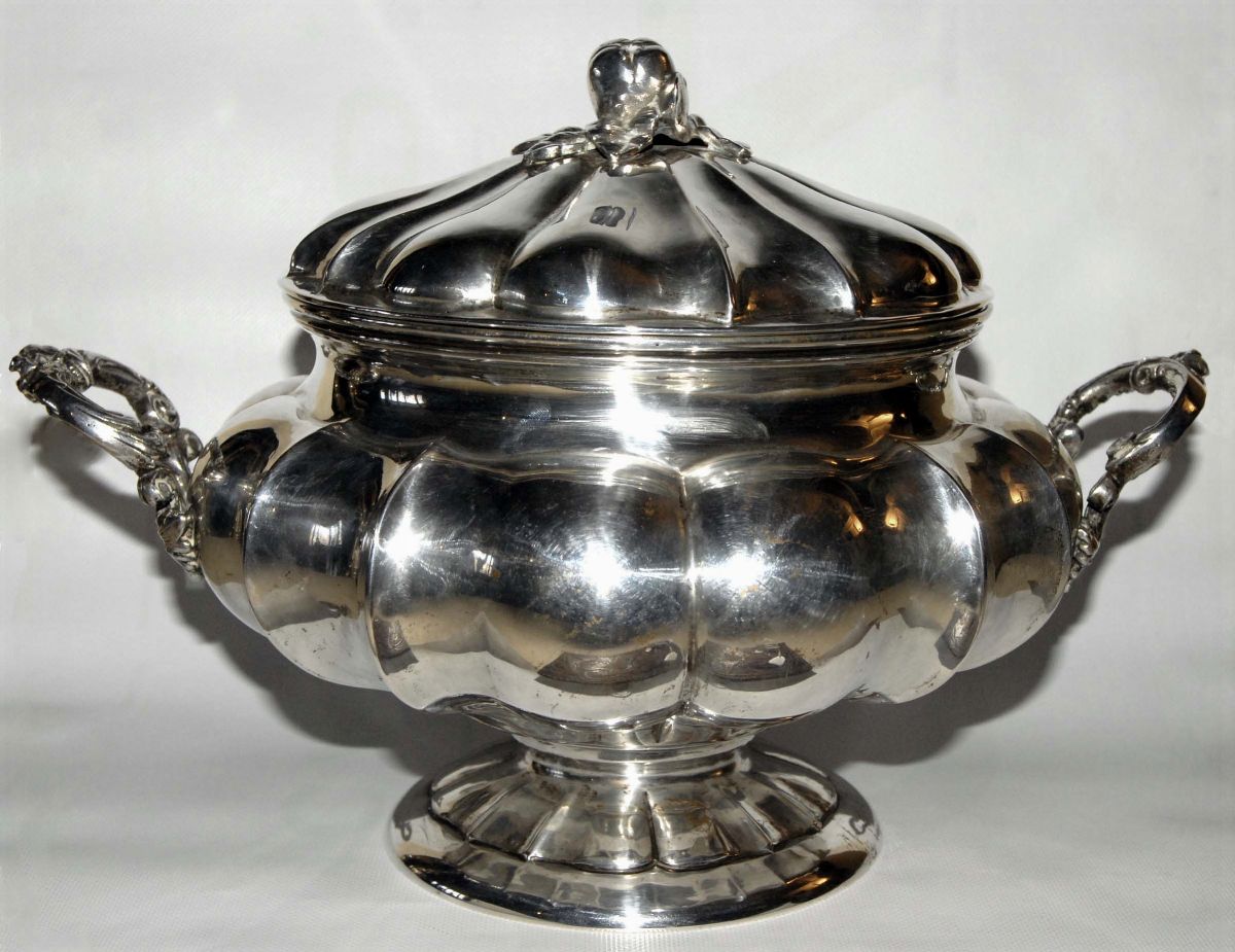 Zuppiera in argento sagomata con manici, gr. 1900 circa