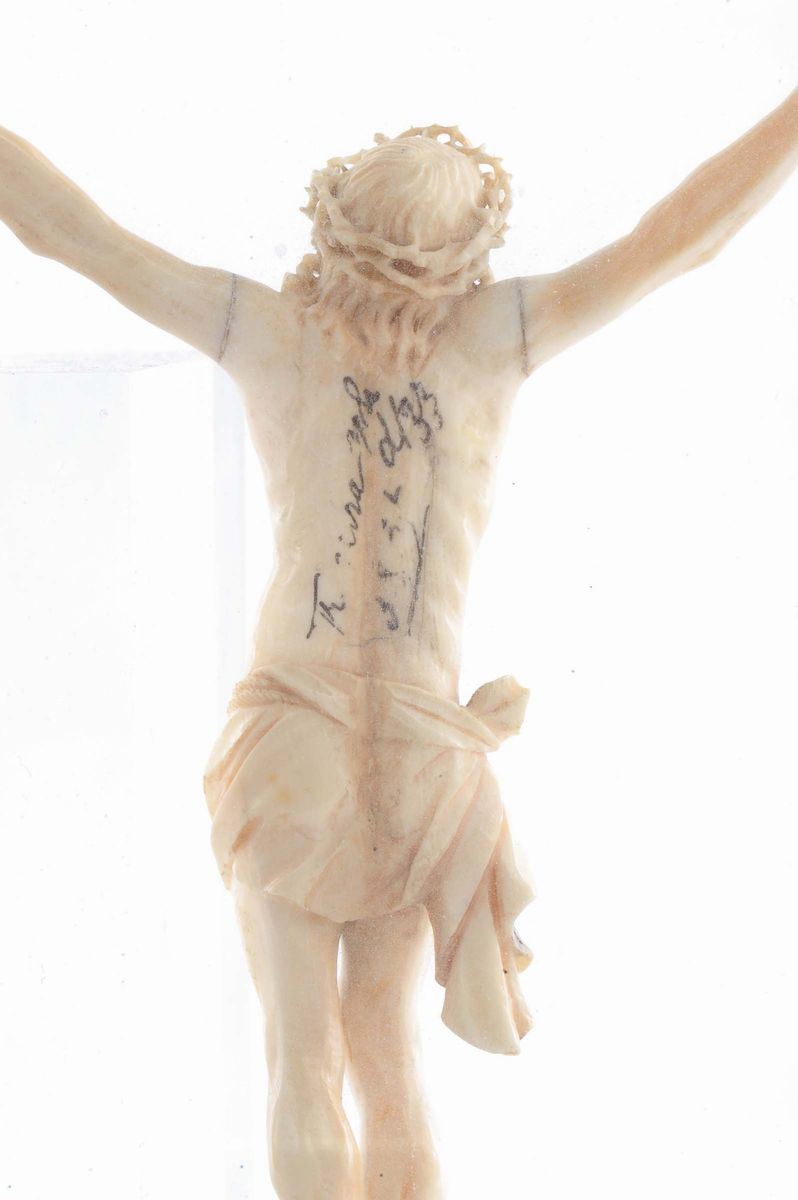 La scultura è raffigurata nei modelli di gusto barocco ed è accompagnata dal cartiglio con scritta INRI. Sul retro della figura iscrizione ad inchiostro.