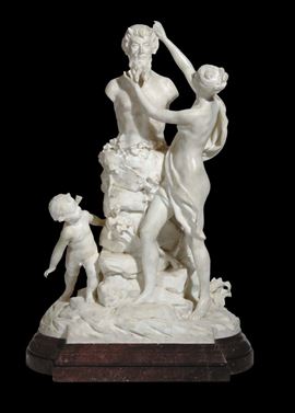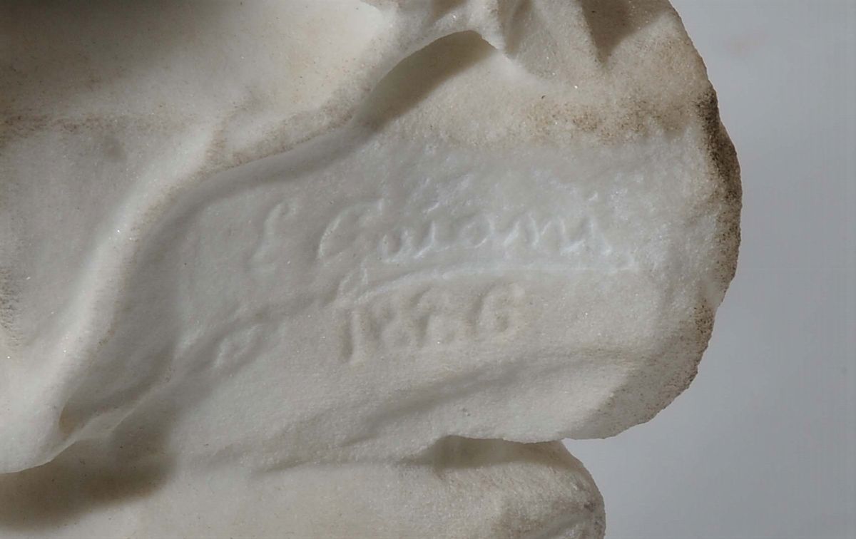 gruppo scultoreo in marmo bianco su base modanata e sagomata in marmo colorato, firmata e datata, cm 60x39x93