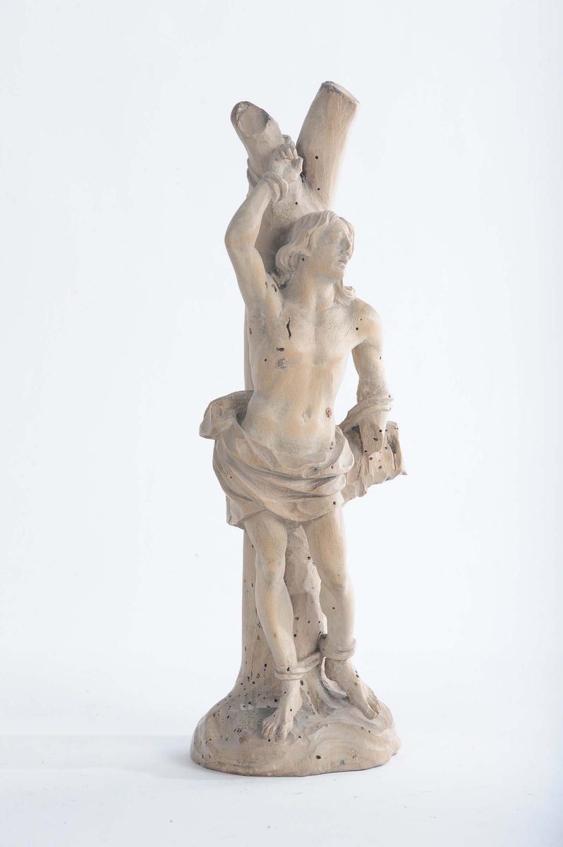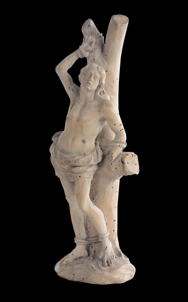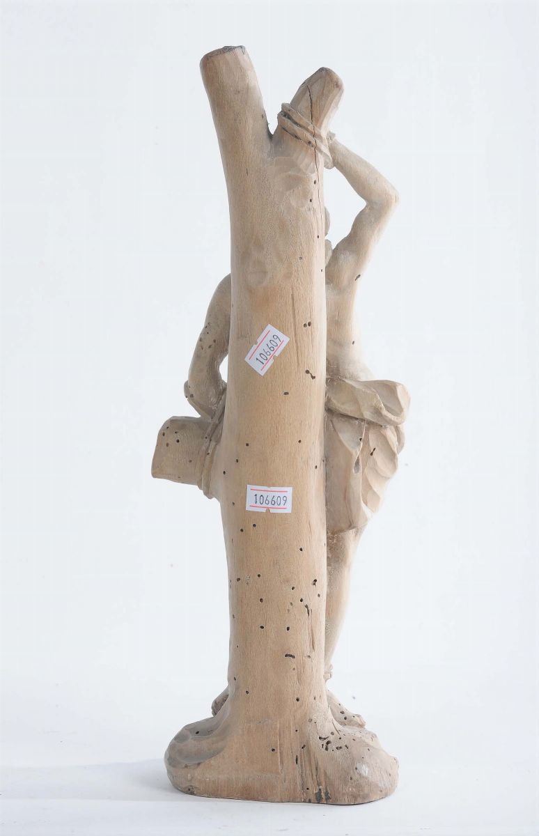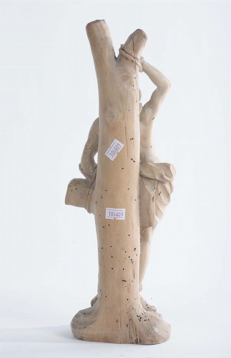 La figura del Santo nell’atto di essere trafitto è scolpita in legno di tiglio. Già collezione R. Amati, Londra