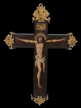 Rara croce in legno dipinto su entrambi i lati con immagine di Cristo e Santa crocifissi, finali in bronzo fuso, cesellato [..]