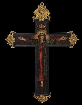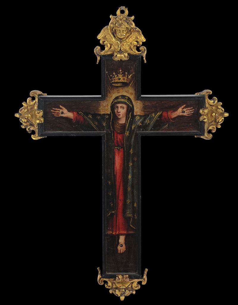 Rara croce in legno dipinto su entrambi i lati con immagine di Cristo e Santa crocifissi, finali in bronzo fuso, cesellato e dorato, XVII-XVIII secolo