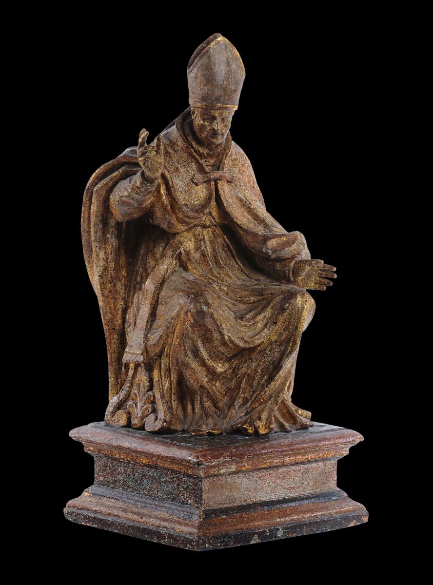 La figura del Papa assiso e benedicente, poggiante su un plinto con cornici modanate, conserva ancora traccia della doratura originale ed è probabilmente un bozzetto per un’opera più grande.