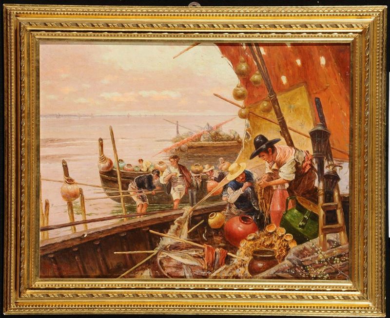 Riccardo Pellegrini (1863-1934) Scena di mercato sulle barche