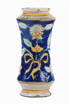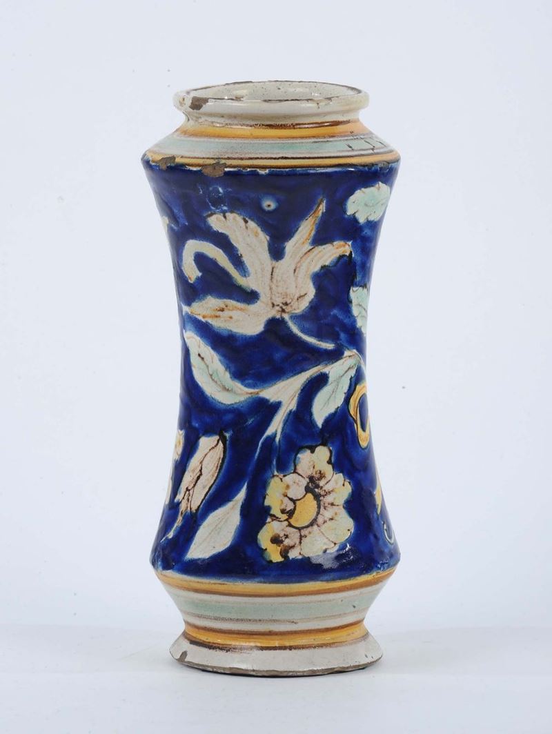 decoro policromo a girali fioriti su fondo blu, altezza cm 28 (lievi sbeccature)