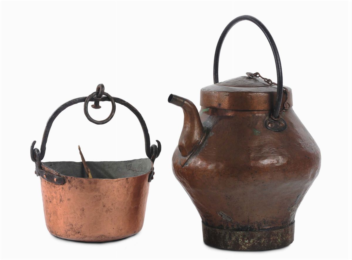 Brocca e due paioli in rame