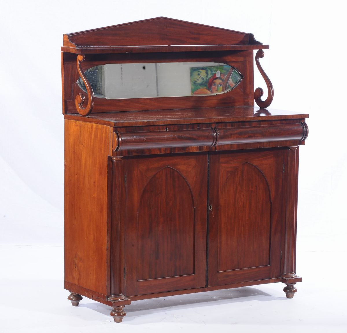 due ante alla base, due cassetti, alzata con specchio centrale, cm 107x44x130