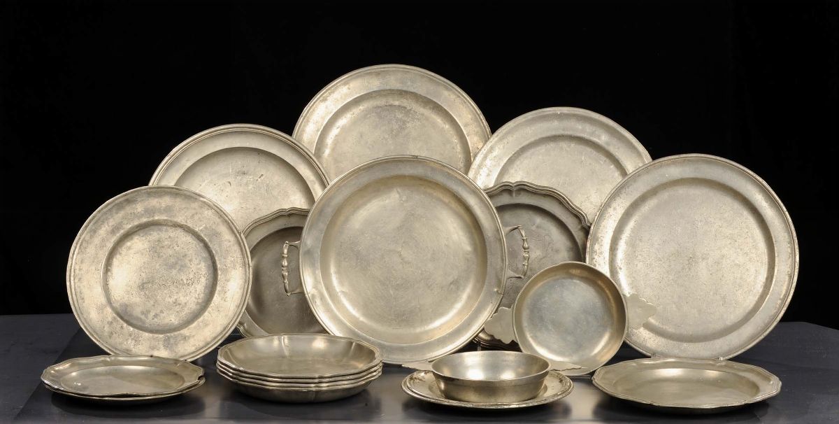 Lotto composto da diciannove piatti in peltro di dimensioni diverse