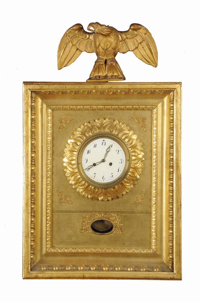 quadrante smaltato con numeri arabi in nero, aquila in legno intagliato sulla sommità, cm 60x37,5