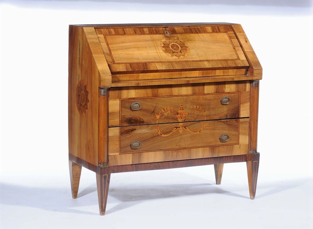 due cassetti sotto la calatoia che cela cassettini, gambe troncopiramidali, colonne sui montanti, cm 100x45x100