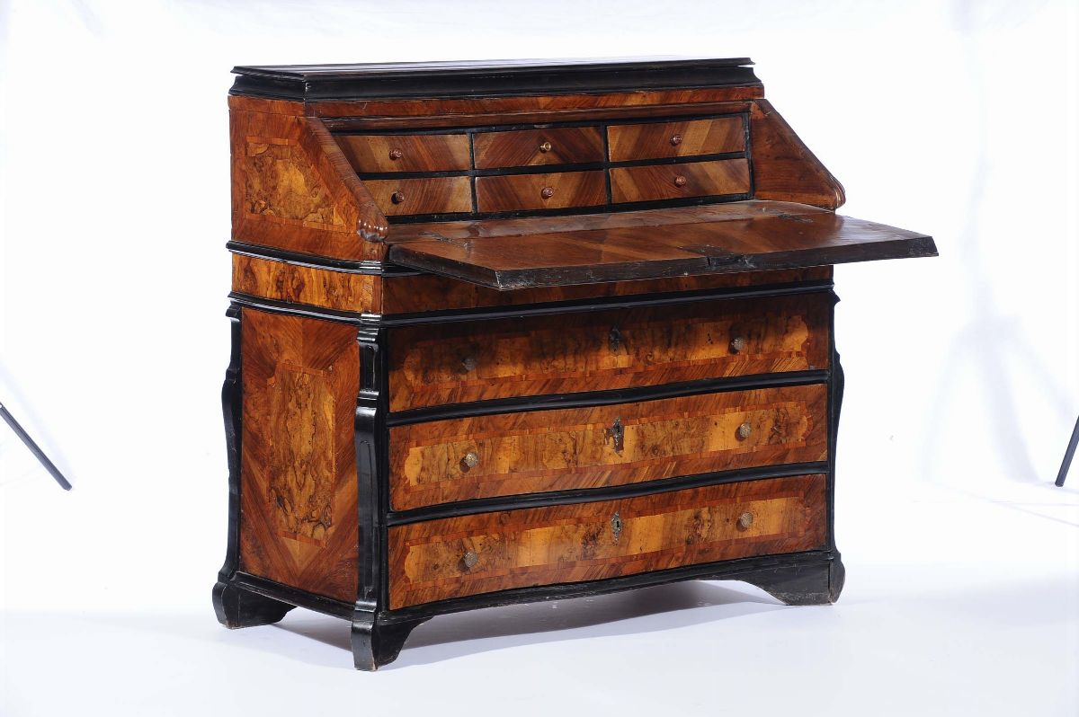 Ribalta Luigi XIV interamente lastronata in radica, Lombardia XVIII secolo