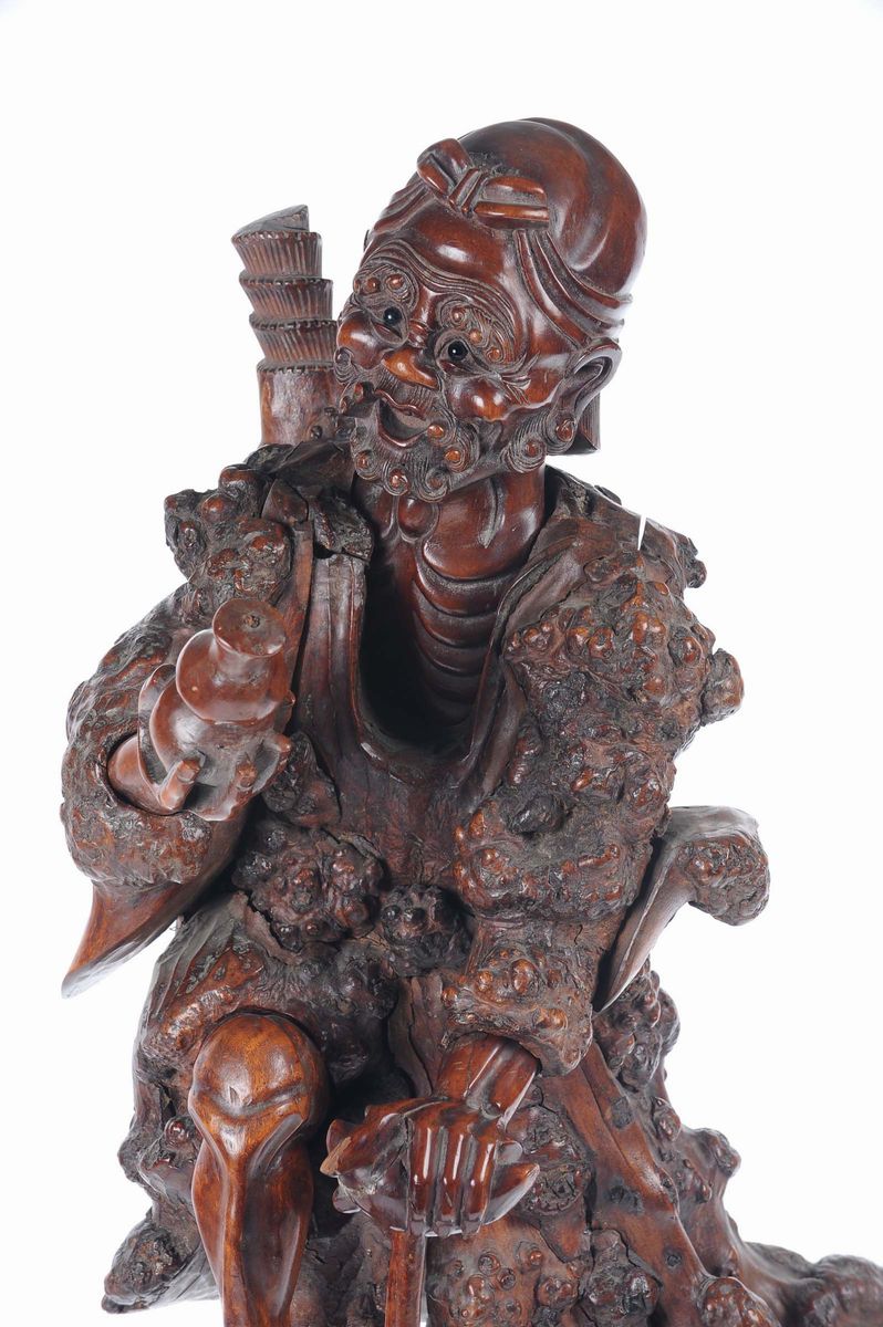 Scultura in legno intagliato raffigurante personaggio orientale con gallina