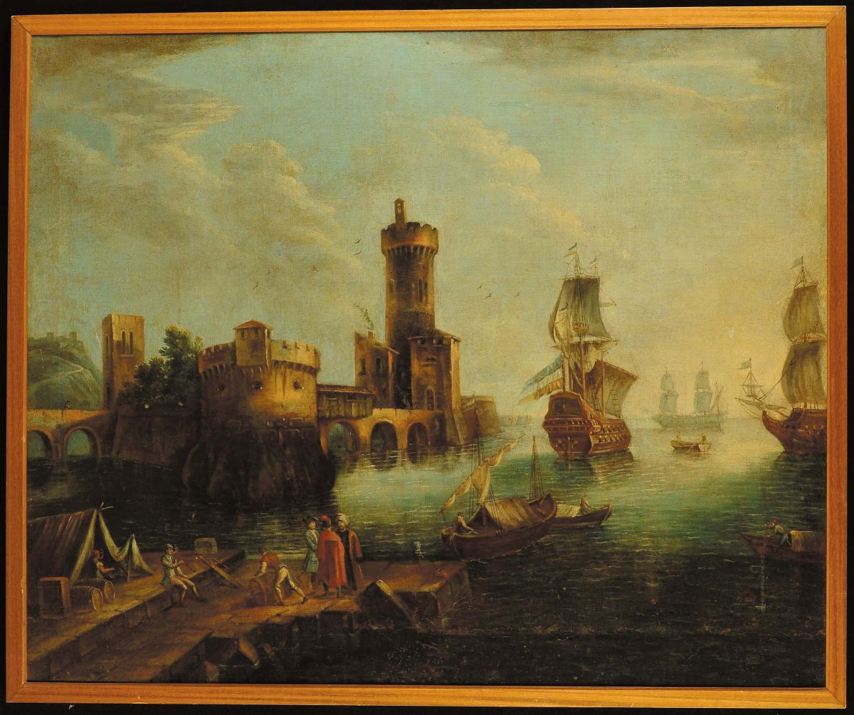 Scuola della fine del XVIII secolo Velieri in entrata in un porto Veliero in uscita da un porto