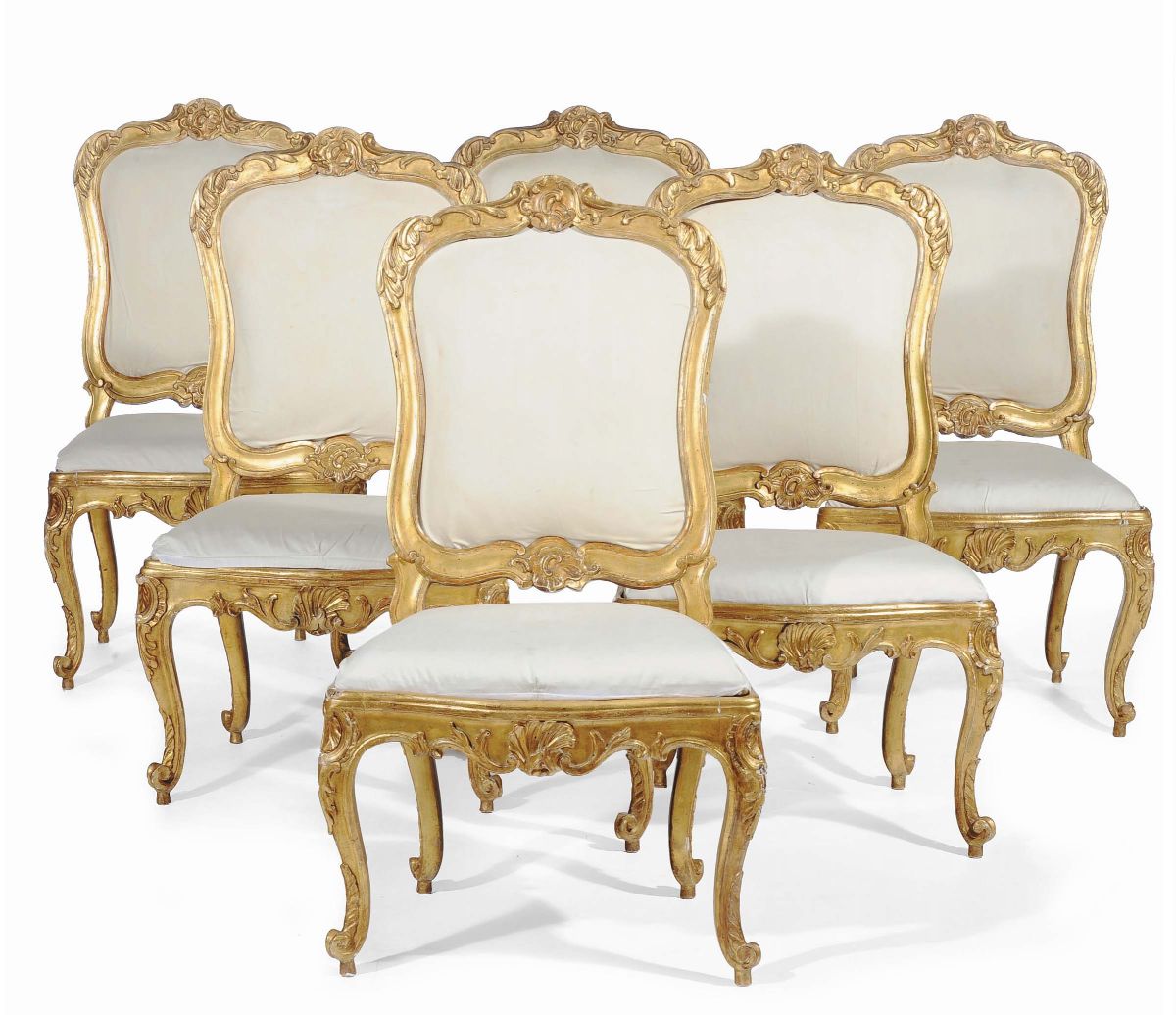 Sei sedie Luigi XV in legno intagliato e dorato, Roma XVIII secolo