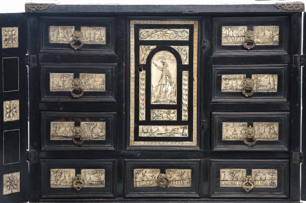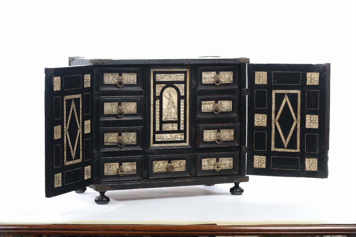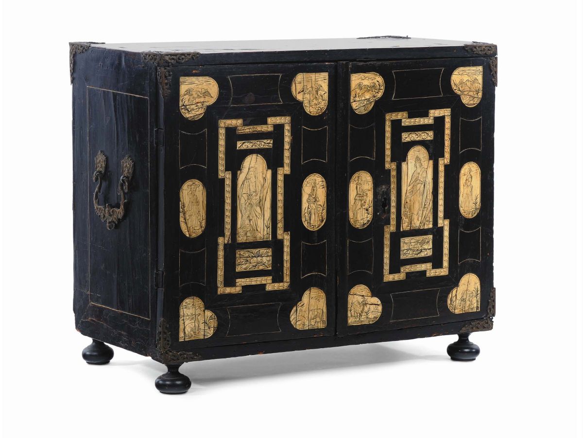 Stipo a due ante in legno ebanizzato ed intarsiato in avorio, XVIII secolo