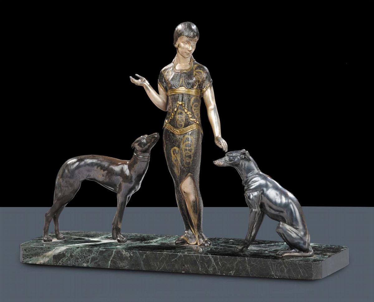 Gruppo scultoreo raffigurante gentildonna con coppia di levrieri