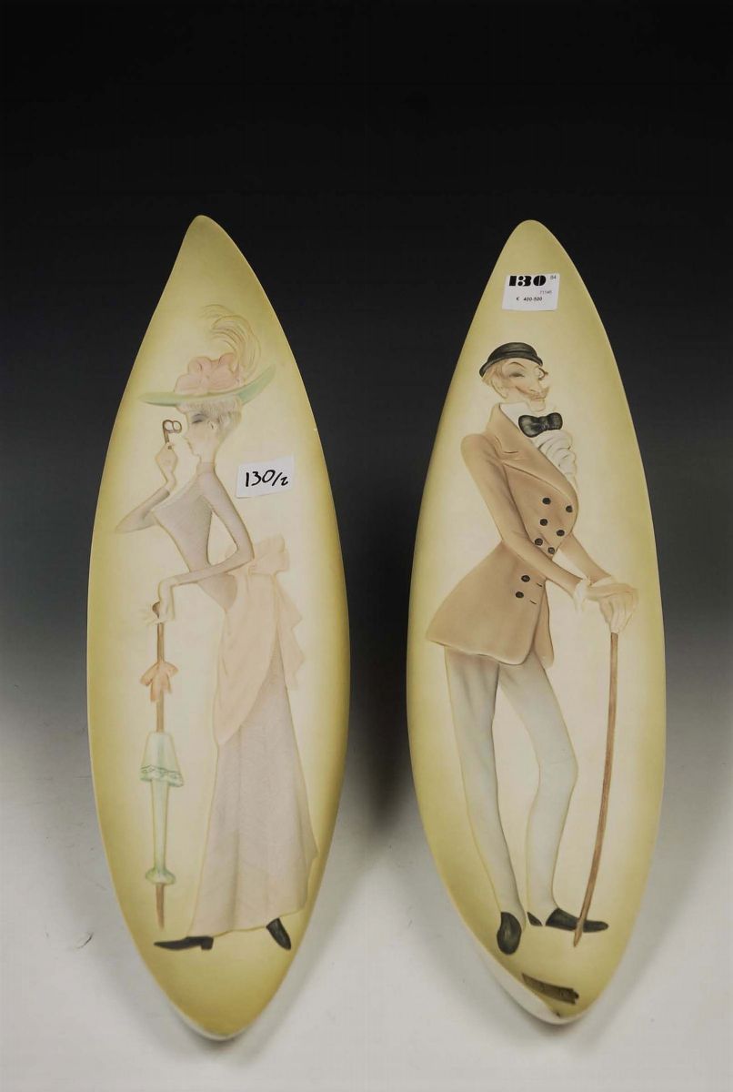 Coppia di placche da muro in terracotta modellata a colaggio e decorata in policromia raffiguranti, in chiave ironica, un signore e una signora in abiti ottocenteschi. Marchio della manifattura sul retro di ogni placca; etichetta cartacea su una delle due. 1950 circa, altezza cm 58